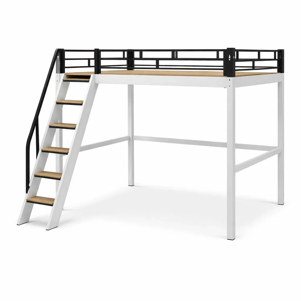 Lit mezzanine en métal et bois avec escalier