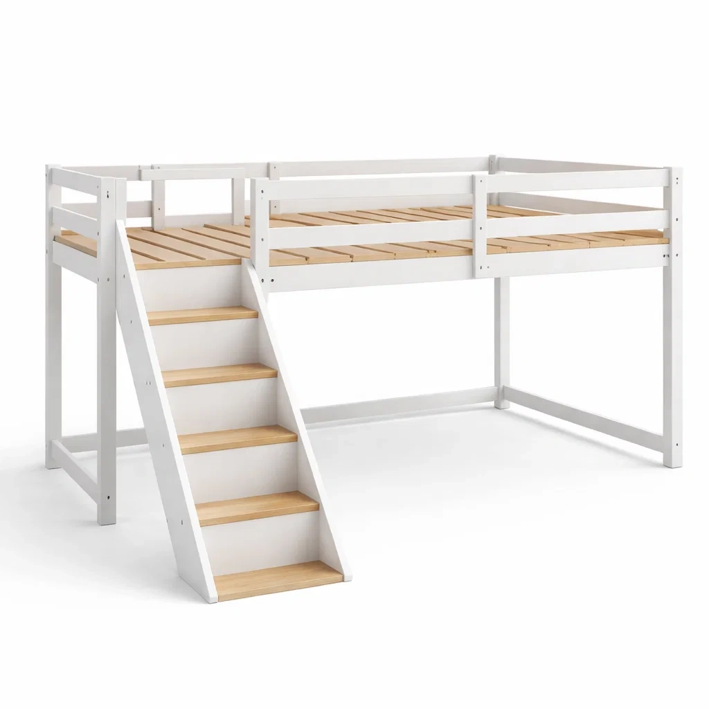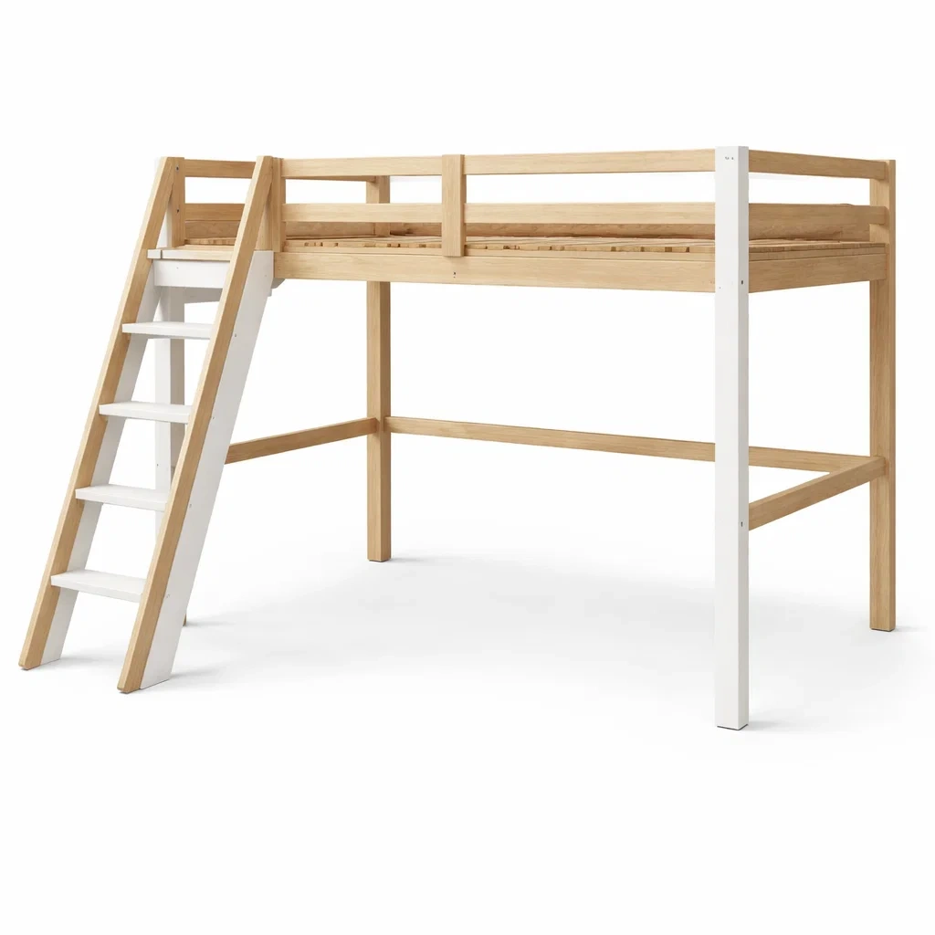 Lit mezzanine en bois blanc et naturel avec échelle