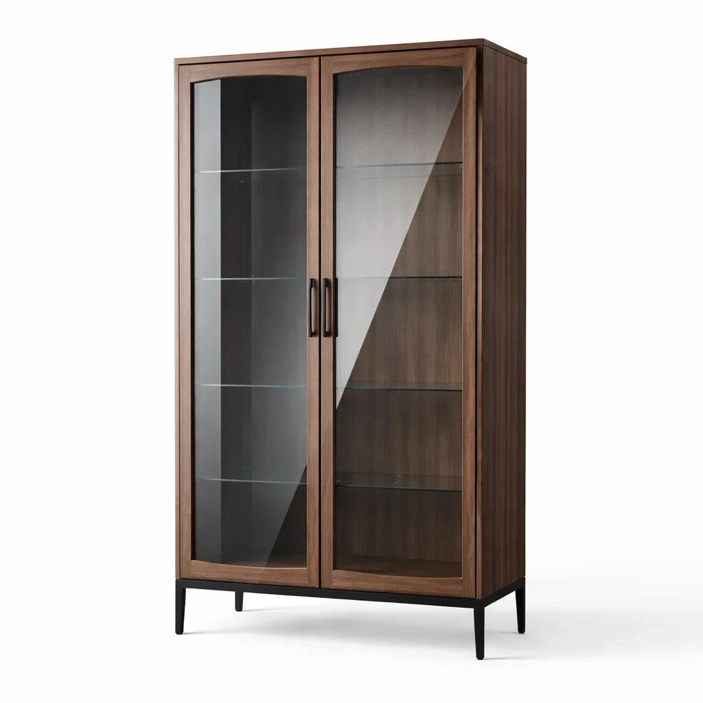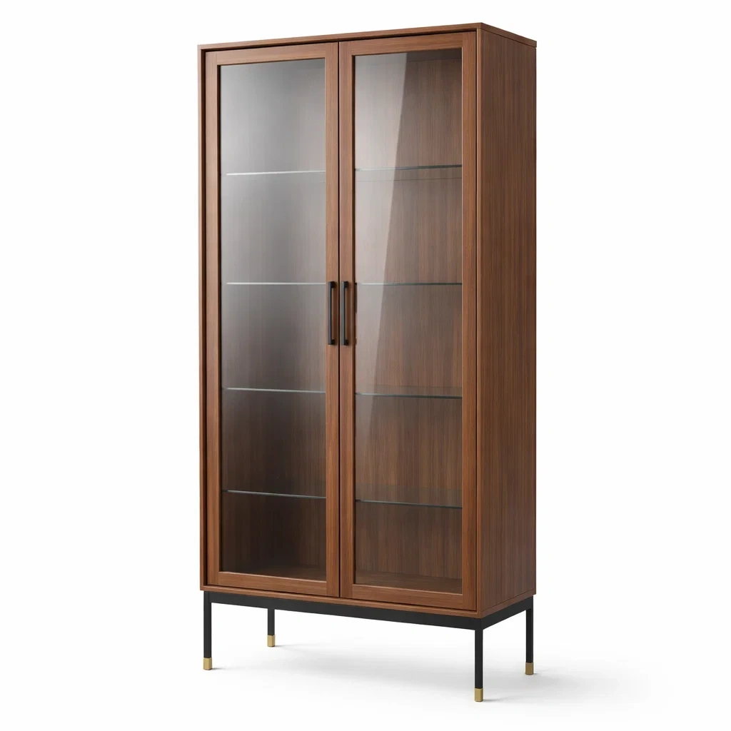 Vitrine en verre trempé et métal avec bois plaqué