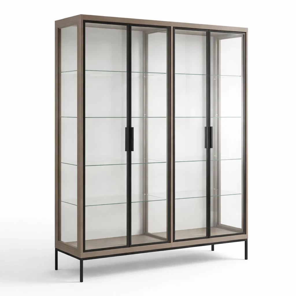 Vitrine en verre trempé avec portes en chêne foncé et cadre métallique