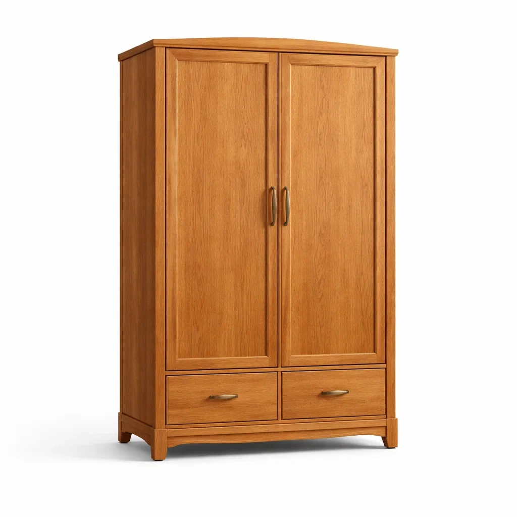 Cette armoire est fabriquée en bois de chêne avec une finition vernis transparent. Elle mesure 190 cm de hauteur, 120 cm de largeur et 50 cm de profondeur. Le poids total est de 75 kg.