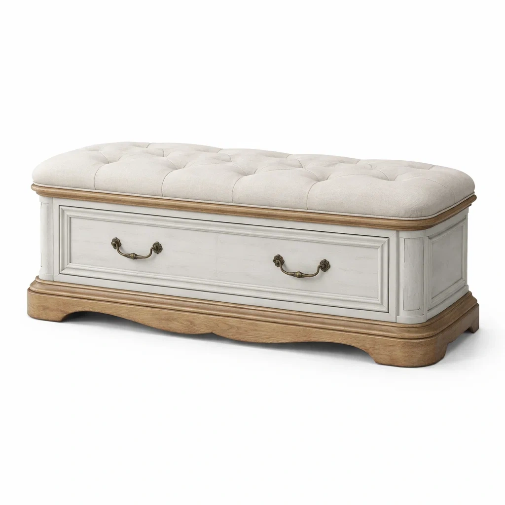Ce banc de rangement est fabriqué en bois de pin massif avec un rembourrage en tissu beige. Il mesure 120 cm de long, 40 cm de large et 45 cm de haut. Le tiroir spacieux dispose de poignées en métal pour une ouverture facile. Le cadre en bois assure une structure robuste. Aucun assemblage requis.