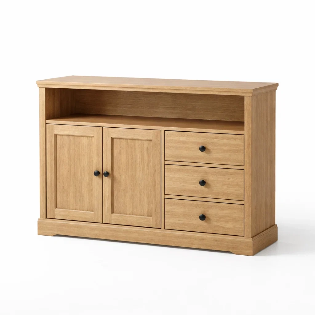 Le buffet est fabriqué en contreplaqué avec une finition en chêne clair. Ses dimensions sont de 110 cm de longueur, 40 cm de largeur et 80 cm de hauteur. Il dispose de 2 portes, 3 tiroirs et 1 étagère ouverte pour le rangement. Le poids total est de 30 kg. L'entretien se fait avec un chiffon humide.