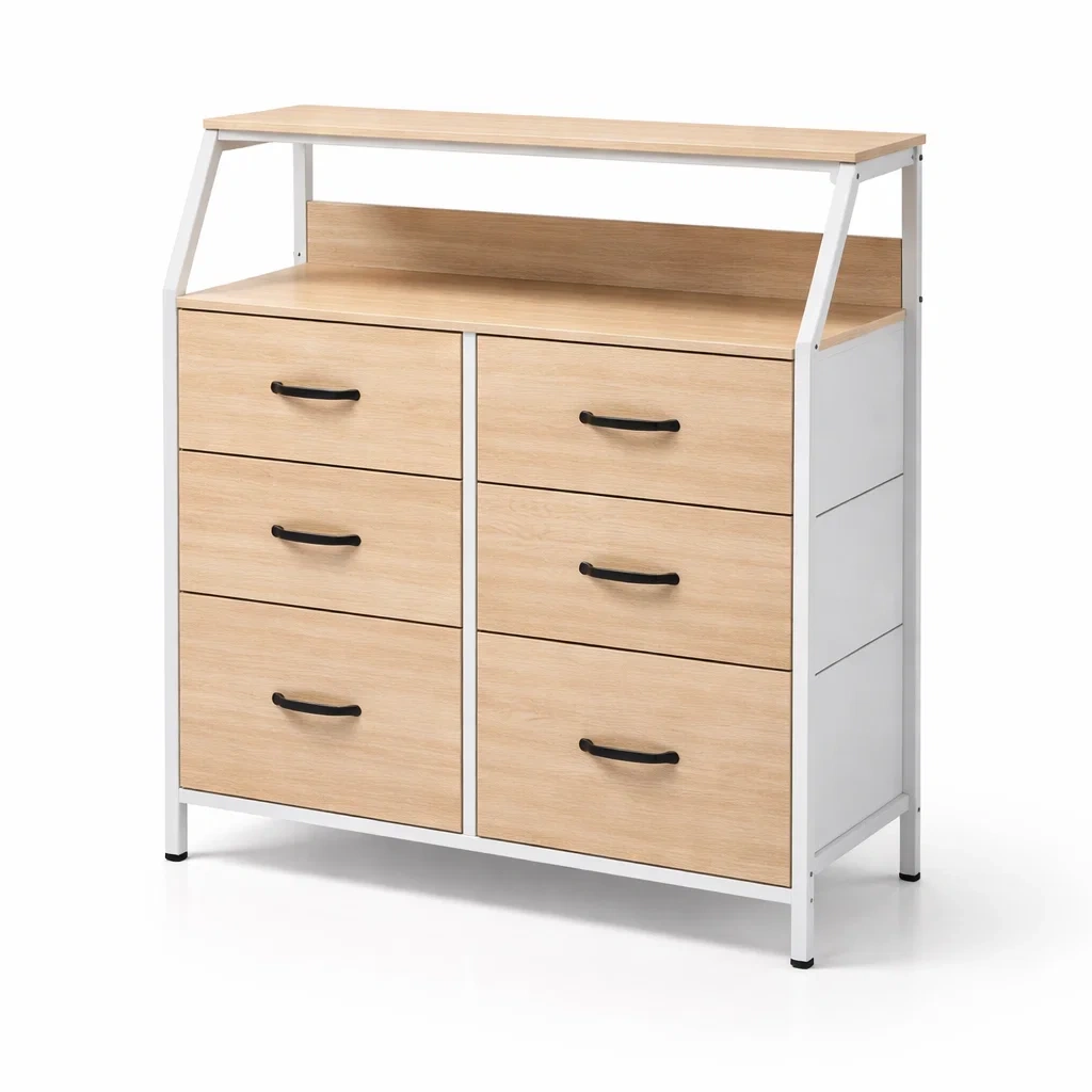 La commode comprend un cadre en acier robuste et des panneaux de fibres de densité moyenne (MDF) avec une finition mélaminée. Poignées en métal noir pour une durabilité accrue.