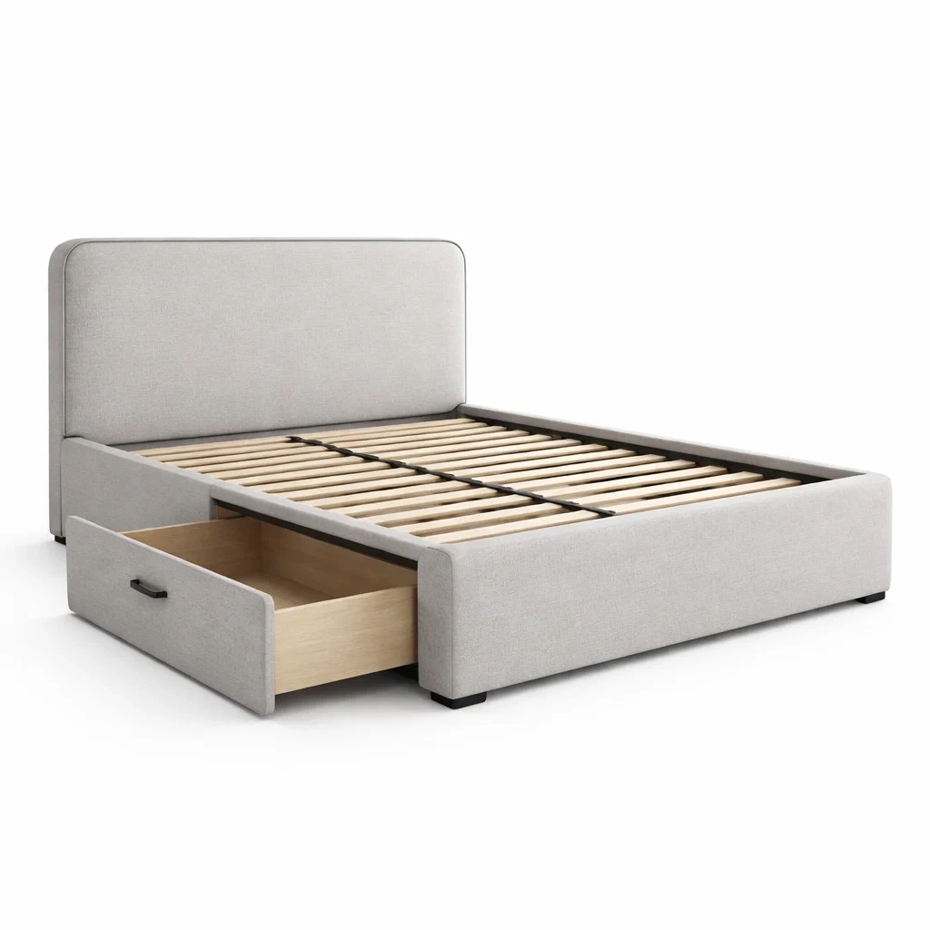 Design : tête de lit rembourrée; pieds en bois massif; un tiroir de rangement intégré.