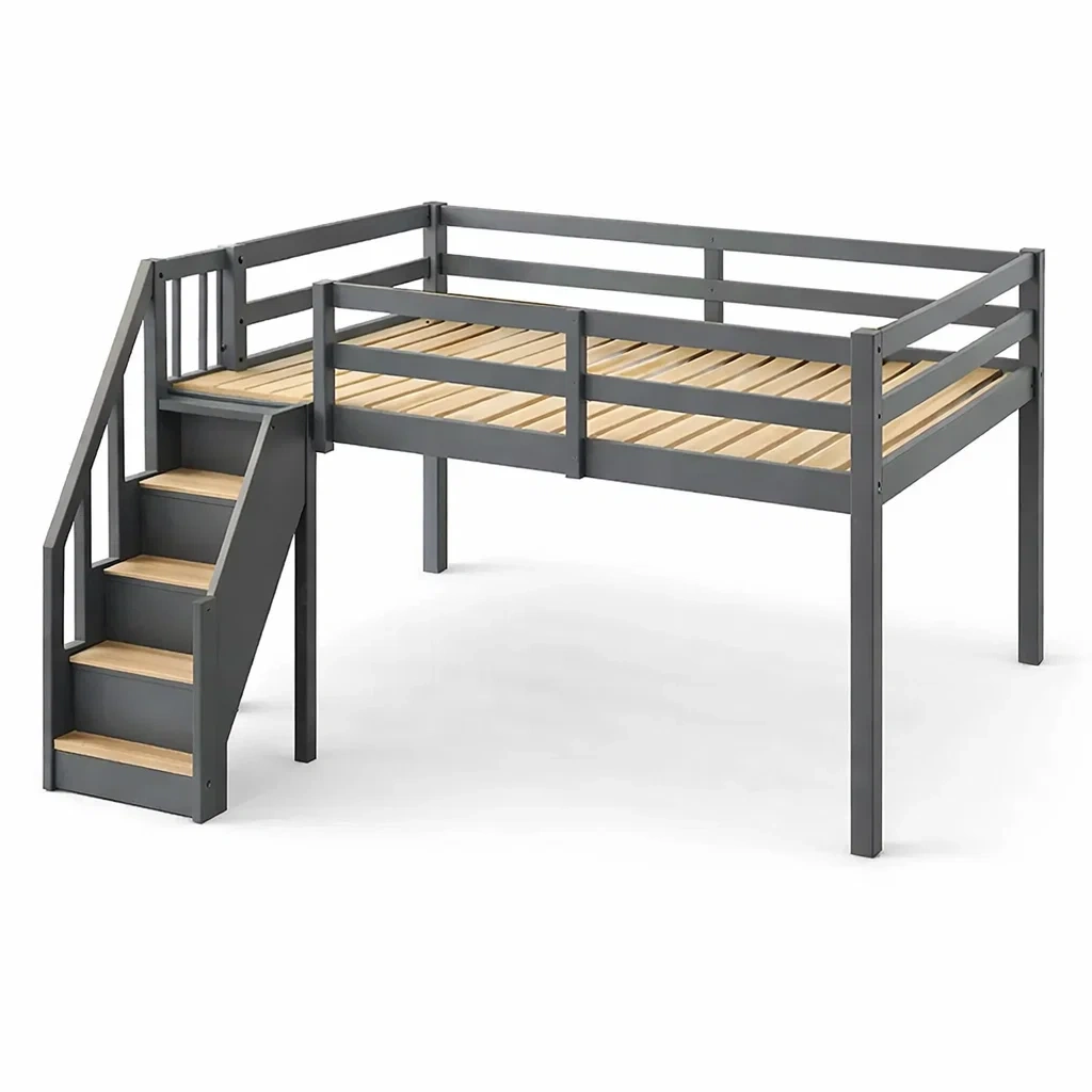 Le lit mezzanine est fabriqué en métal robuste et en bois de pin. Il est équipé d'un escalier pour faciliter l'accès. La capacité de charge maximale est de 100 kg.