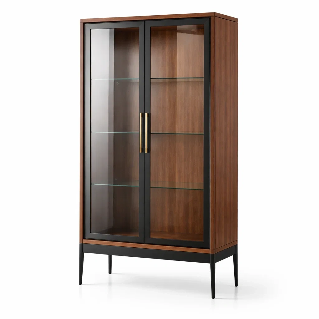 Vitrine en bois de noyer et métal avec étagères en verre trempé